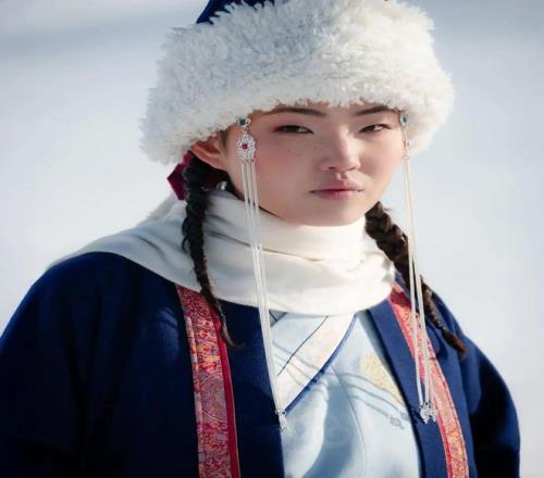 本次隊服由Goyol Cashmere設計,整體在傳統蒙古族傳統長袍“德勒”的基礎上做了側開叉的創新。高立領和交疊前襟搭配絲質滾邊和傳統的羊角紋保留了傳統蒙袍的結構,細節在冰原上格外鮮活。這是那種——站在雪原上,一眼就不會認錯的遊牧民族文化自信。