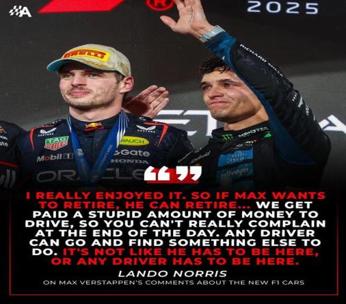 然而整個測試期間,最引人矚目的並不是這些數據,而是維斯塔潘與諾裏斯針對新規賽車的言論。維斯塔潘在結束三天的測試後毫不掩飾自己的失望,直言2026款賽車“不怎麽好玩”,更像是"升級版的FE"。他還批評了新車對能量管理過於依賴,無法全油門駕駛,有時在直道末端必須提前鬆開油門甚至降檔,隻為給電池多回收一點電量。