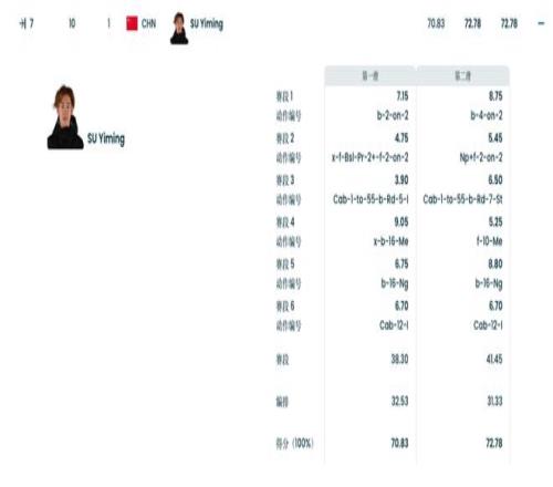 在第一輪比賽中,第10位出發的蘇翊鳴獲得了70.83分,排在第6名。第二滑蘇翊鳴的表現更為出色,不過由於第四個動作選擇了難度較低的正身1080 Melon抓板,單個動作僅收獲5.25,最終第二滑獲得了72.78分。