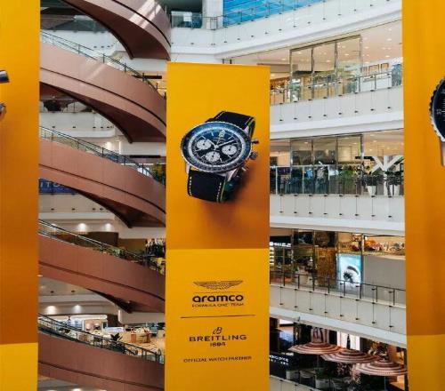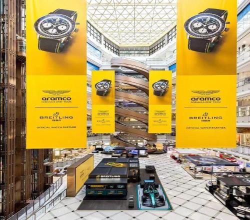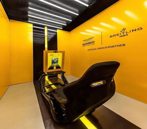複古磚牆作為背景,黑色鋼結構作為空間骨架,帶著一點機械氣質的結構感,也讓人聯想到車庫或維修區。而在色彩上,百年靈標誌性的黃色與阿斯頓·馬丁經典的賽車綠被放在同一個空間裏使用,兩種極具辨識度的顏色碰撞在一起,既有品牌摩登複古的氣質,也自然帶出了賽車運動的速度感。