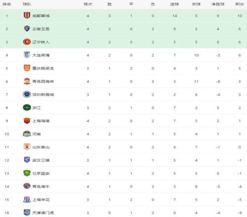 在積分榜上,成都蓉城3勝1平,拿到10分,高居榜首。雲南玉昆、遼寧鐵人和大連英博都是6分,排名第2到第4。上海海港贏球之後,總積分達到1分,升到第9名。山東泰山2勝2負,0分,排名第11。北京國安輸球後,也是負1分,排名第13。上海申花負5分,排名第15。