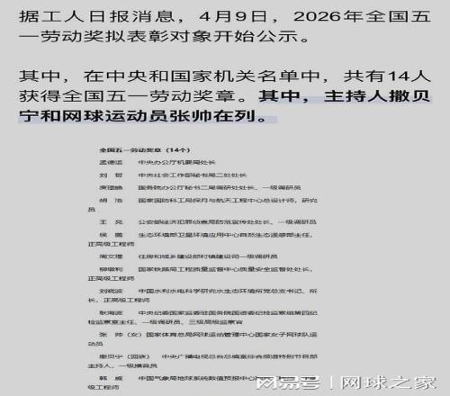 對於張帥來說,有一條好消息,這就是她獲評了今年的全國五一勞動獎章。在中華全國總工會的公示名單中,張帥是唯一的網球運動員。恭喜她!