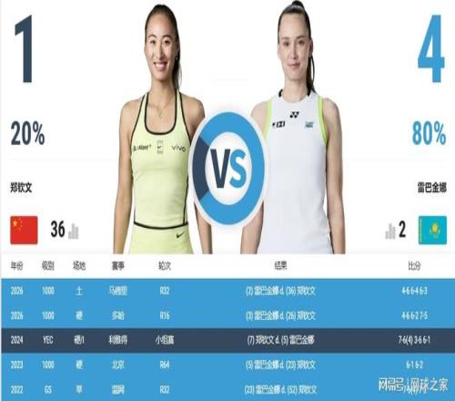 此前,鄭欽文與萊巴金娜交手四次,前者以1勝3負落後。鄭欽文唯一的勝利來自於2024年的年終總決賽小組賽。雙方最近一次交手發生在今年的多哈站第四輪,鄭欽文在6-4先勝一盤的情況下,接著以2-6 5-7被萊巴金娜逆轉。